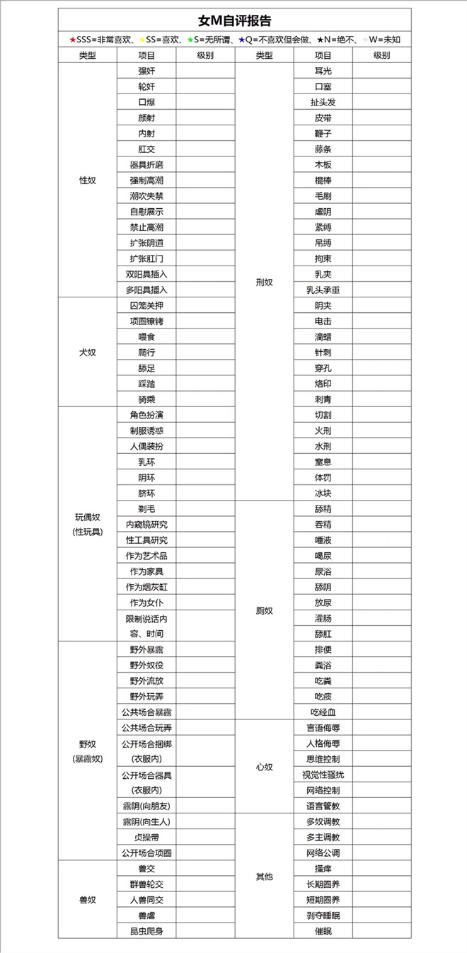 女M自评报告是字母圈新手的“入门指南”,实质上是一份详尽的问卷,旨在帮助女M(或潜在女M)明确自己的喜好、界限和过往经历。